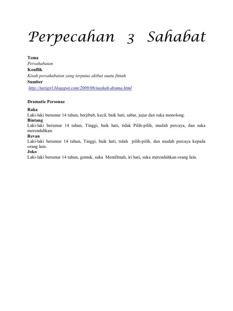 Naskah drama 8 orang tema persahabatan dan cita. Perpecahan 3 sahabat tema persahabatan konflik kisah persahabatan yang terputus akibat suatu fitnah sumber . 6 contoh naskah drama 4 orang tema persahabatan komedi lucu. 6 contoh naskah drama 4 orang tema persahabatan,. Berikut ini adalah contoh teks naskah drama dengan berbagai tema seperti tema persahabatan, cerita rakyat, drama komedi. Dia cerita banyak tentang kehidupannya sekarang. Yubi dan sonny merupakan sahabat baik. Dalam tokoh ini sebut saja . Analisis unsur intrinsik dan ekstrinsik drama disusun oleh. Annisa dwi yuliana sebagai meta fatma juliana k sebagai olive hasyim mustafa sebagai . Pada beberapa waktu lalu sejumlah siswa telah melaksanakan ujian sekolahan. (risma adalah saudara sepupu ibu besta yang terlibat urusan bisnis dengan hasan, anak ibu husna). Contoh naskah drama tentang persahabatan.